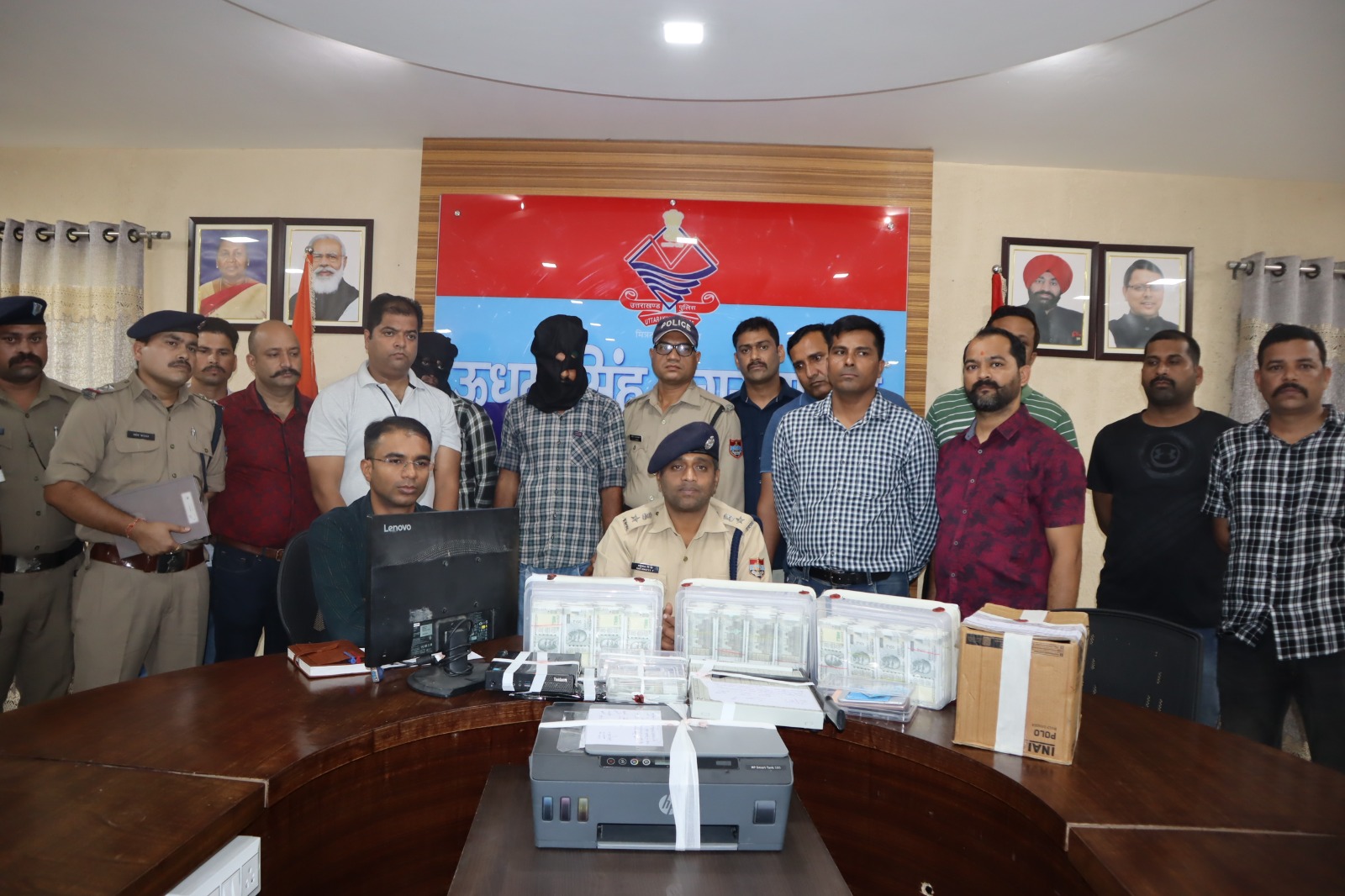 वरिष्ठ पुलिस अधीक्षक ने बताया कि पुलिस टीम ने चैकिंग के दौरान काशीपुर क्षेत्र में पुराना ढेला पुल के पास सड़क किनारे बाइक पर बैठे राजेन्द्र सिंह उर्फ राजू पुत्र सतनाम सिंह निवासी बैराज कालोनी मौहल्ला शक्तिनगर थाना व जिला बिजनौर उत्तर प्रदेश और बूटा सिंह पुत्र नरेन्द्र सिंह निवासी भोगपुर पो0 बढ़ापुर तहसील व थाना नगीना जिला बिजनौर को 2208500 (बाईस लाख आठ हजार पांच सौ रुपये ) नकली करेंसी नोट 500 रुपये के कुल 4417 नोट व पांच सौ के एकतरफा छपे कुल 18 नोट के साथ गिरफ्तार किया गया। पूछताछ के बाद अभियुक्तों की निशादेही पर बिजनौर बड़ापुर भोगपुर स्थित रोड के किनारे जनसेवा केन्द्र के अंदर जाली नोट बनाने की मशीन, मानीटर लेनोवो कंपनी,एक अदद प्रिंटर HP कंपनी,एक अदद मिनी सीपीयू,एक डाटा केबिल व एक अदद पेपर कटर जिसमें ब्राईट आफिस लिखा तथा एक पेपर रिम कुल 100 अदद, एक तरफ छपे हुये जाली नोट दो, OMV336910 के दो, OMV336911के दो तथा बिना सीरियल नंबर अंकित नोट के पिछले सिरे के एक तरफ छपे हुये कुल 12 नोट तथा पूर्ण रुप से छपे हुये सीरियल नंबर OCM536760 का एक नोट तथा OCM 536736 के दो नोट बरामद किये।