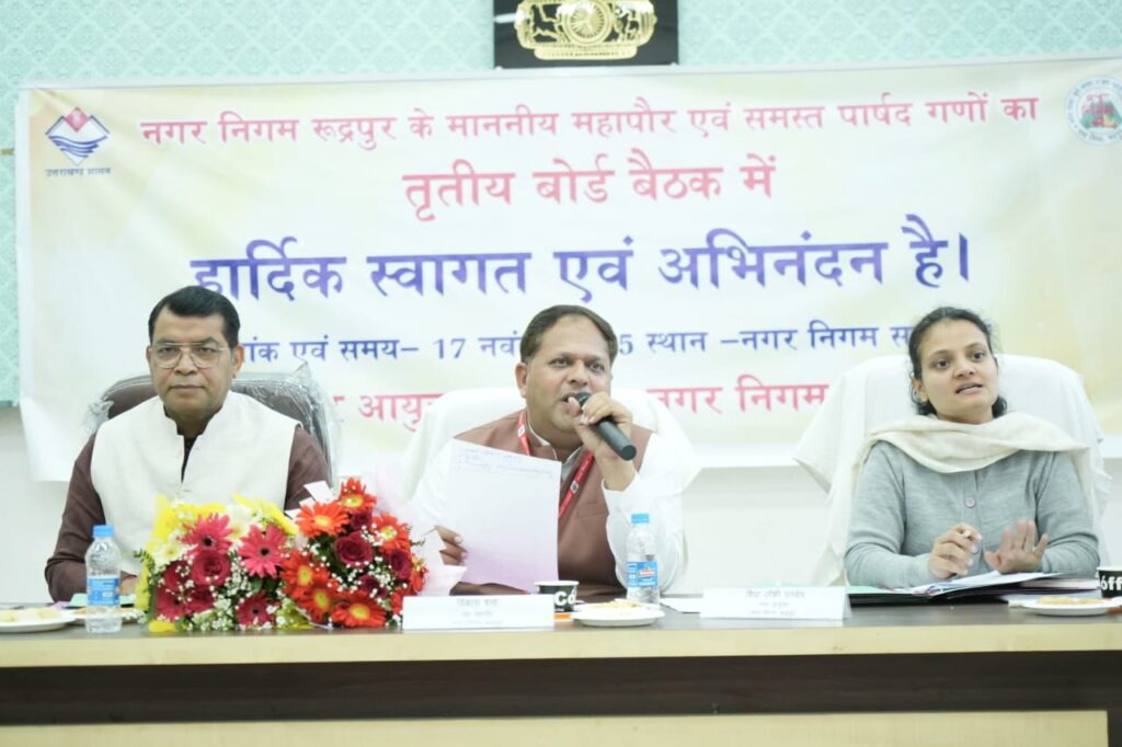 रूद्रपुर। नगर निगम की बोर्ड बैठक सोमवार को महापौर विकास शर्मा की अध्यक्षता में आयोजित हुई, जिसमें शहर के व्यापक विकास हेतु कई अहम प्रस्ताव पारित किए गए। बैठक की शुरुआत में पार्षदों द्वारा उठाए गए मुद्दों पर महापौर ने तुरंत संज्ञान लिया और मौके पर ही अधिकारियों को कार्रवाई के निर्देश दिए। दर्जनों प्रस्तावों को सर्वसम्मति से पारित करते हुए महापौर ने कहा कि आज लिये गये निर्णय रूद्रपुर की दशा और दिशा बदलने वाले साबित होंगे।
