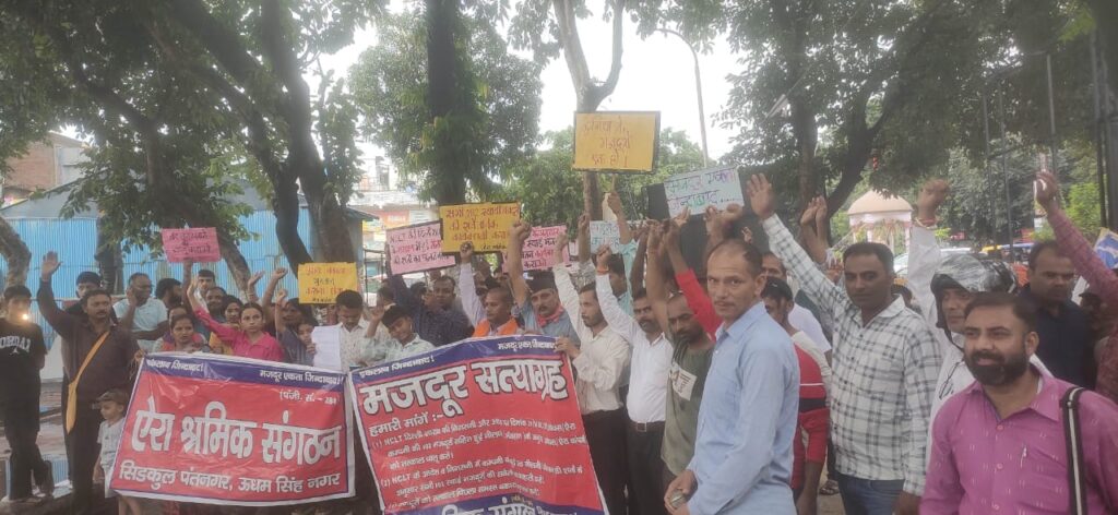 रुद्रपुर- गांधी पार्क में मजदूरों का सत्याग्रह -102 स्थाई श्रमिकों की कार्यबहाली की मांग